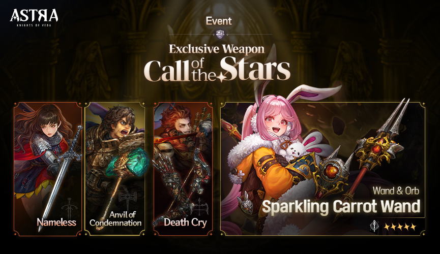 : The Pickup Exclusive Weapon Event Exclusive Weapon “Sparkling Carrot Wand (Wand & Orb),” and “Nameless (Longsword)” will not be added to the regular Call of the Stars afterwards.