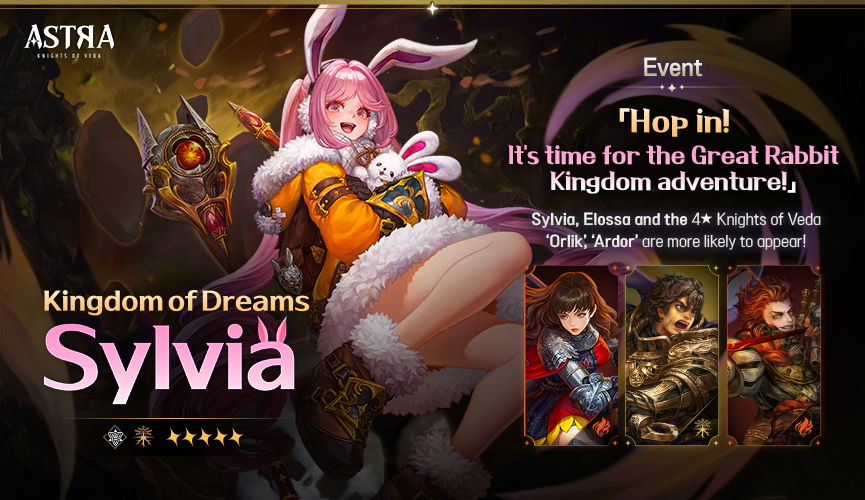 - During the event period, participating in the "Pickup Hero Event: Kingdom of Dreams," and “Pickup Hero Event: Swordsmaster of the Veil” guarantees a 100% appearance rate for the respective 5★ Knight of Veda, “Kingdom of Dreams Sylvia,” and "Swordsmaster of the Veil Elossa."
