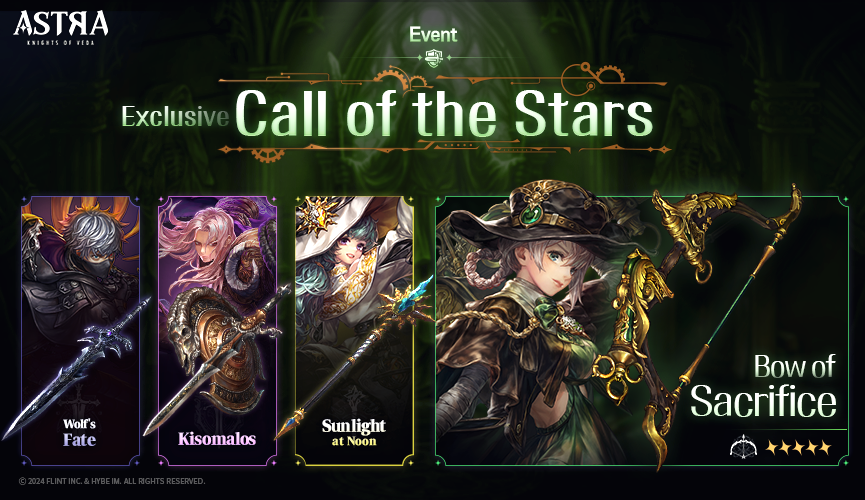 - During the event period, when proceeding with the 'Event Call of the Stars: Research that never stops' the appearance rate of 5★ Weapon 'Bow of Sacrifice' will increase.