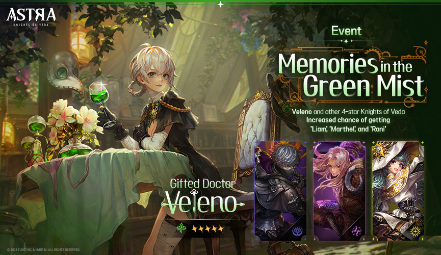 - During the event period, when proceeding with the 'Event Call of the Stars: The Gifted Doctor' the appearance rate of 5★ Knights of Veda "The Gifted Doctor, Veleno" will increase.