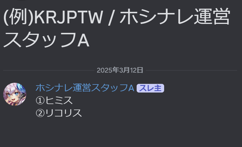 ·例) KRJPTW / ホシナレ運営スタッフA / ① ヒミス、② リコリス