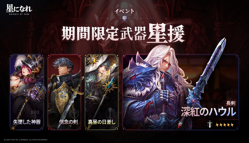 - 本ピックアップ星援では、★5武器登場時、「真紅のハウル(長剣)」が必ず登場します。