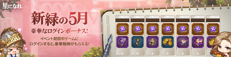 イベント期間中、毎日ログインすれと豪華報酬を獲得できる「新緑の5月記念ログインボーナス」を実施いたします。