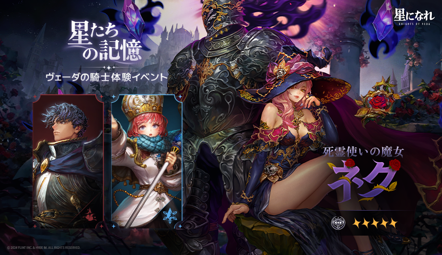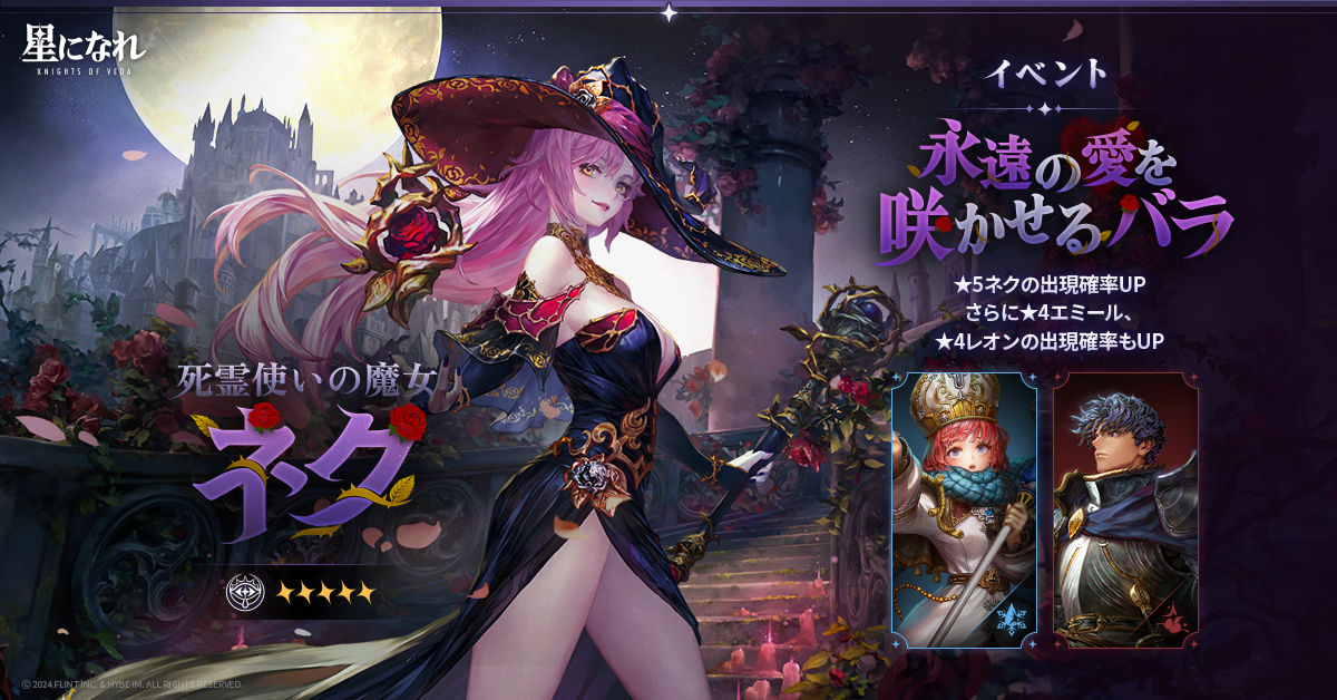 またヴェーダの騎士体験イベント「星たちの記憶(ネク)」では、ピックアップ星援で出現確率がアップしている死霊使いの魔女「ネク」をはじめ、エミール、 レオン を体験することができます。