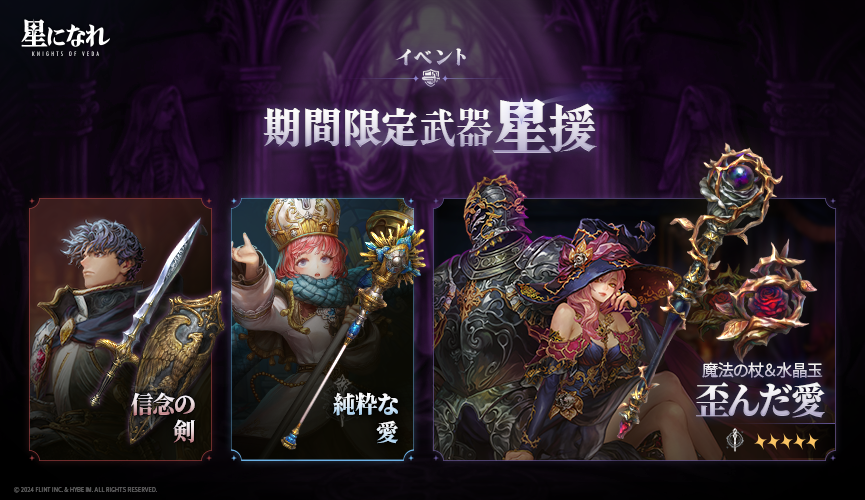 -本ピックアップ星援では、★4武器「純粋な愛(杖)」「信念の剣(剣&盾)」の出現確率がアップします。
