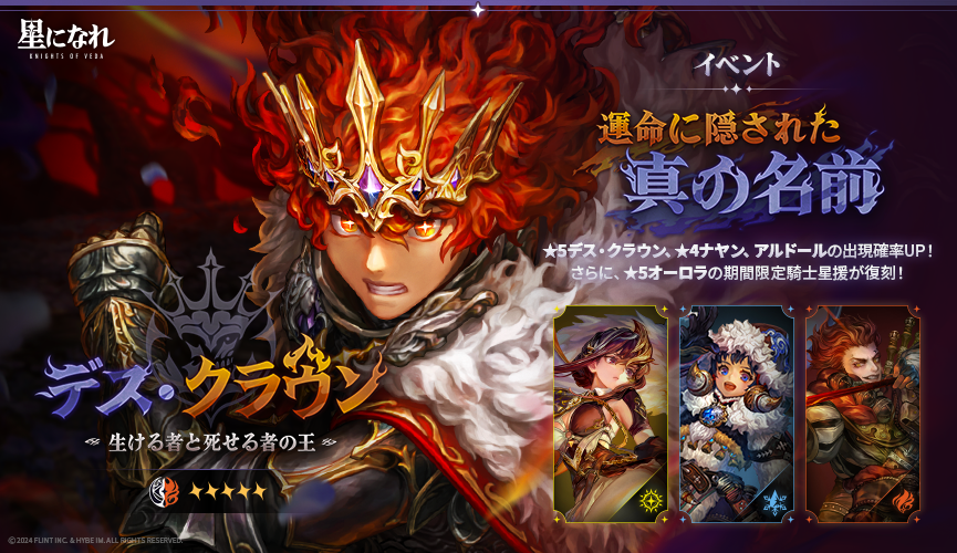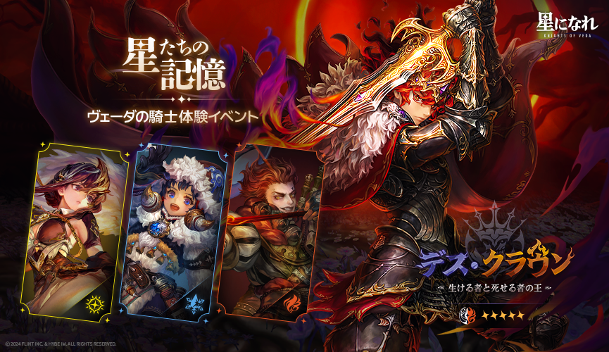 またヴェーダの騎士体験イベント「星たちの記憶(デス・クラウン/オーロラ)」では、ピックアップ星援で出現確率がアップしている生ける者と死せる者の王 「デス・クラウン」と光速の矢 「オーロラ」をはじめ、「ナヤン」、「アルドール」を体験することができます。