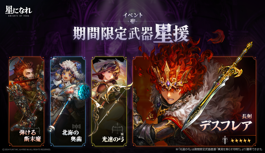 - 本ピックアップ星援では、★5武器「デスフレア(長剣)」の出現確率がアップします。