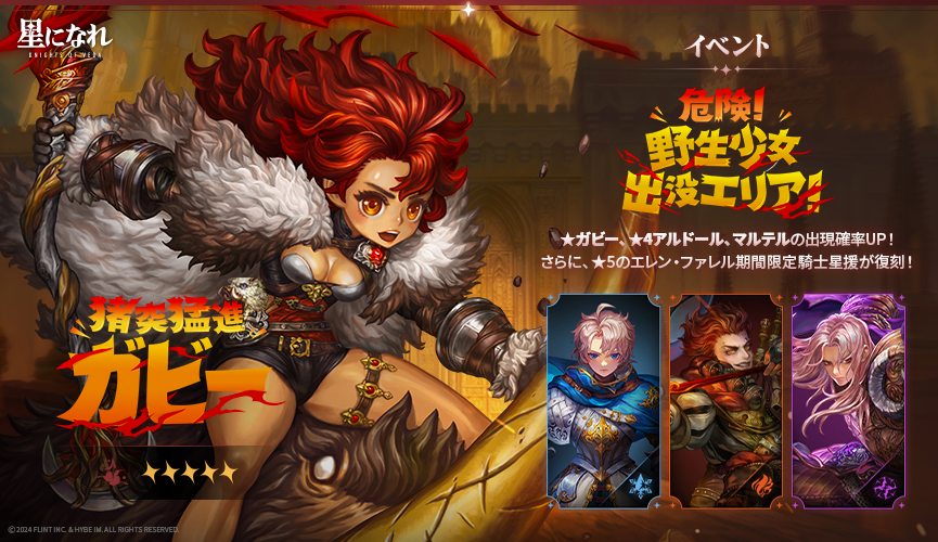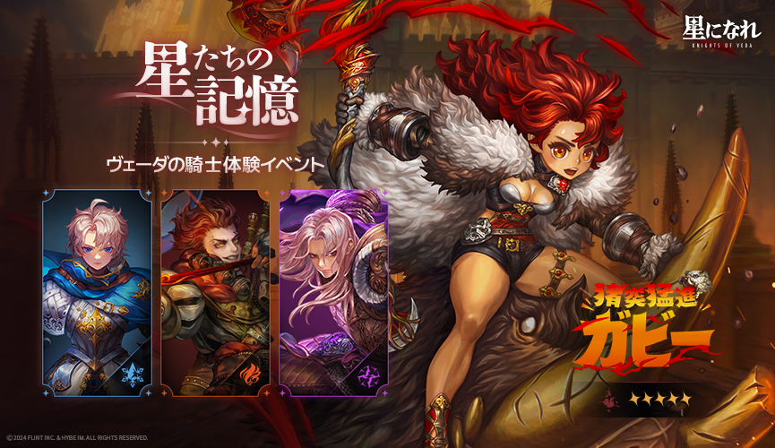 またヴェーダの騎士体験イベント「星たちの記憶(ガビー/エレン・ファレル)」では、ピックアップ星援で出現確率がアップしている猪突猛進「ガビー」と波動の剣「エレン・ファレル」をはじめ、「アルドール」「マルテル」を体験することができます。