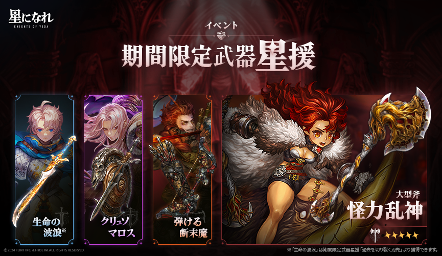 - 本ピックアップ星援では、★5武器「生命の波浪(大型剣)」の出現確率がアップします。