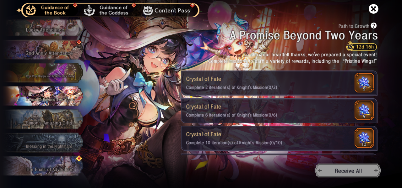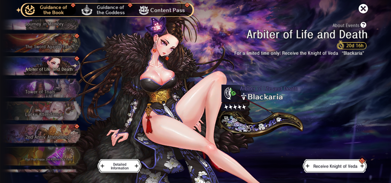 - 「2周年ありがとうパック」には、ピックアップヴェーダの騎士選択チケット、ピックアップ騎士専用武器選択チケットなど、