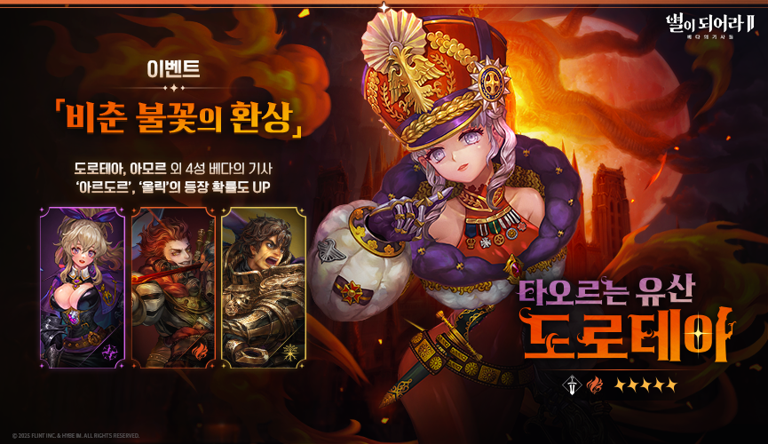 - 이벤트 기간 내 ‘픽업 영웅 이벤트: 타오르는 유산’ 진행 시, ★5 베다의 기사 ‘타오르는 유산 도로테아’가 100%의 확률로 출현합니다.