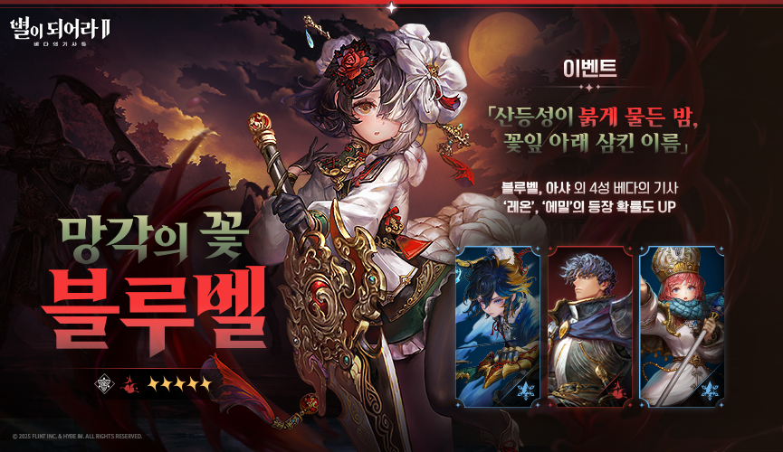 - 이벤트 기간 내 ‘픽업 영웅 이벤트: 망각의 꽃’ 진행 시, ★5 베다의 기사 ‘망각의 꽃 블루벨’이 100%의 확률로 출현합니다.