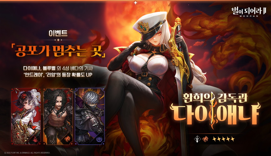 - 이벤트 기간 내 ‘픽업 영웅 이벤트: 환희의 감독관’ 진행 시, ★5 베다의 기사 ‘환희의 감독관 다이애나’가 100%의 확률로 출현합니다.