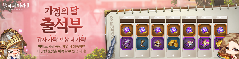 이벤트 기간 동안 매일 로그인하면 출석 보상을 획득할 수 있는 가정의 달 출석 이벤트가 여러분을 찾아갑니다!