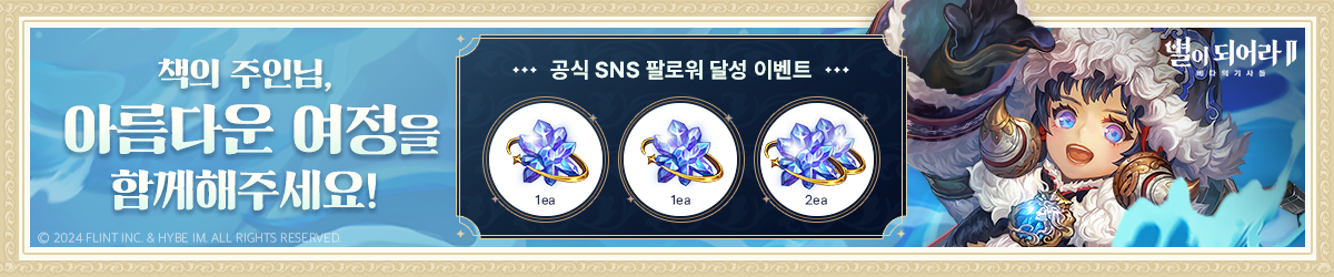 - 팔로워 달성 수는 공지 내에 안내해 드린 ‘별이되어라2: 베다의 기사들’ 공식 SNS 계정 팔로워 수를 기준으로 합니다.