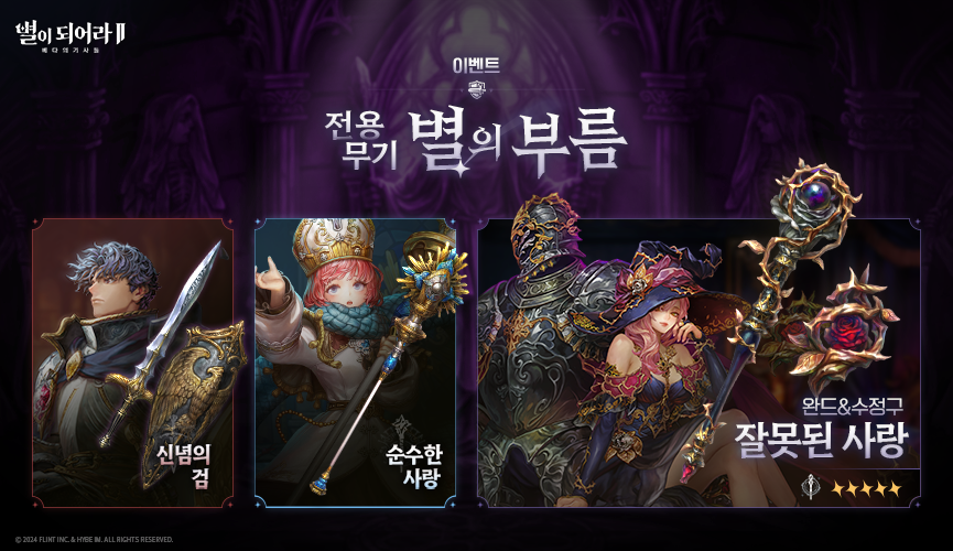 - 이벤트 기간 내 '전용 무기 별의 부름: 침묵 속의 사랑' 진행 시, ★4 무기 ‘신념의 검(검&방패), ‘순수한 사랑(지팡이)’의 출현 확률이 증가합니다.