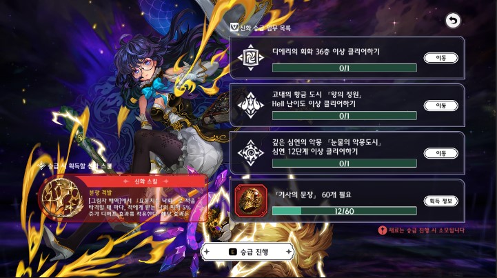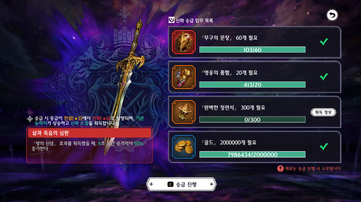 - [신화 승급]은 각각의 기사와 무기에 부여된 특정 미션을 클리어하게 되면 신화 등급으로 승급할 수 있습니다.