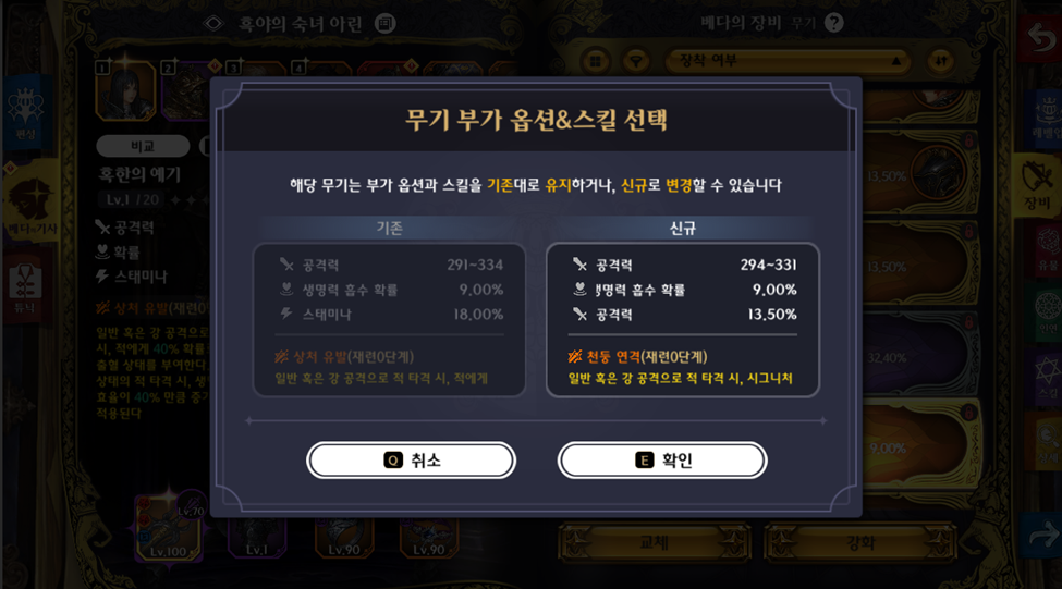 - 신화 승급된 베다의 기사와 전용무기는 기본 능력치가 상승하고 신화 스킬을 획득합니다.