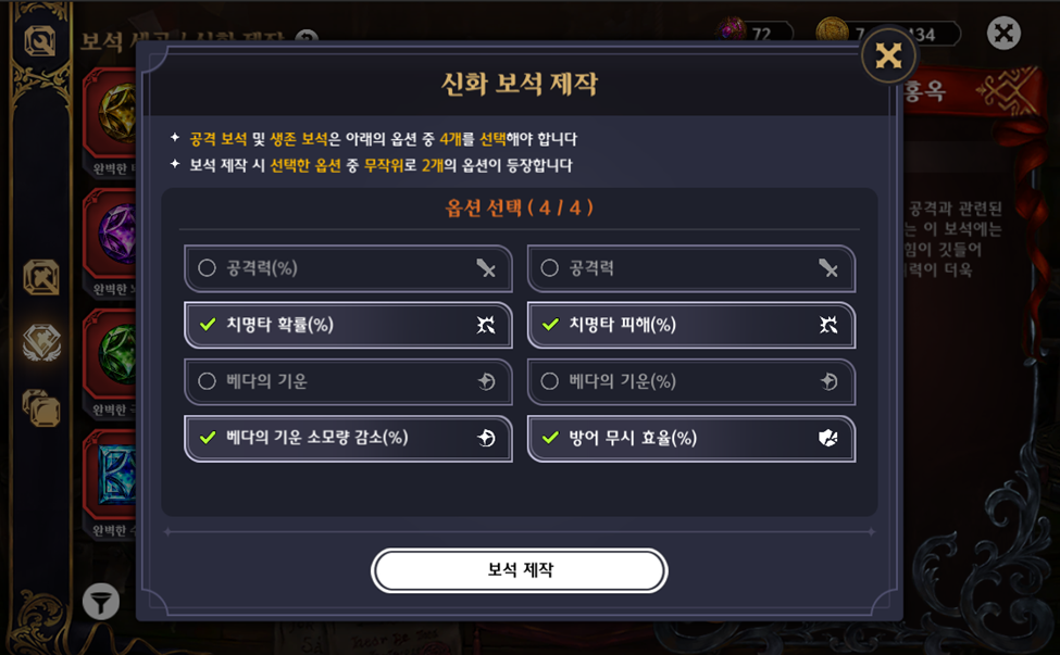 - [신화(★6) 보석] 제작 시 선택 가능한 능력치 중 4개를 선택하면 그 중 2개의 능력치를 부여 받게됩니다.