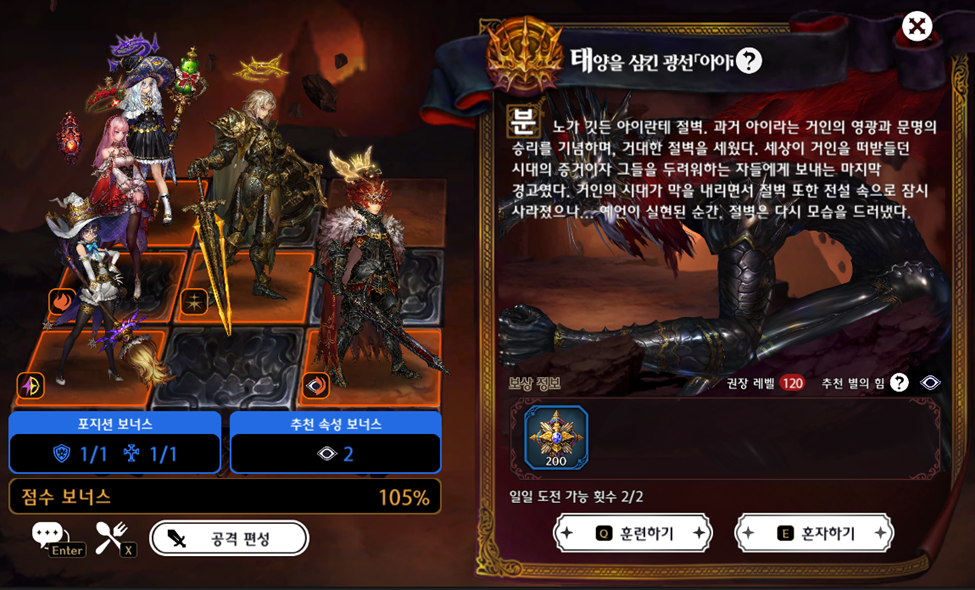 - 해당 보스에 대한 추천 속성이나 요구되는 포지션의 기사를 배치하면 보너스 점수를 획득합니다.