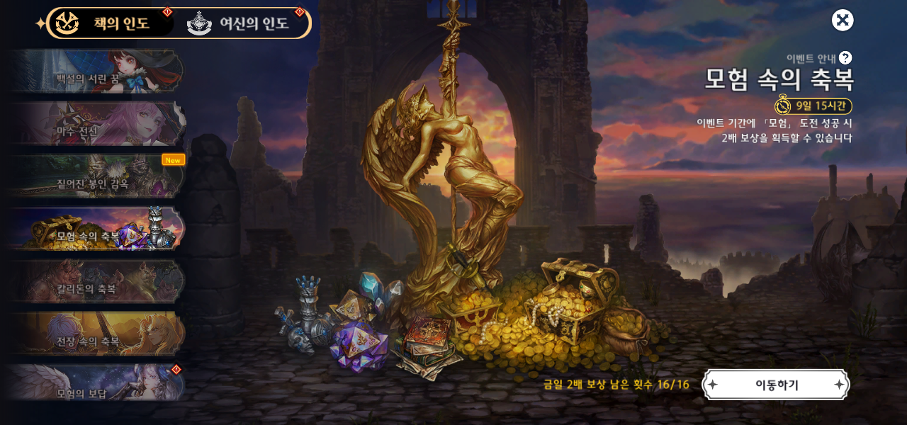 매일 8회 [모험 던전] 보상을 2배로 지급하던 [모험 속의 축복] 이벤트가 매일 16회 도전으로 강화되었습니다.