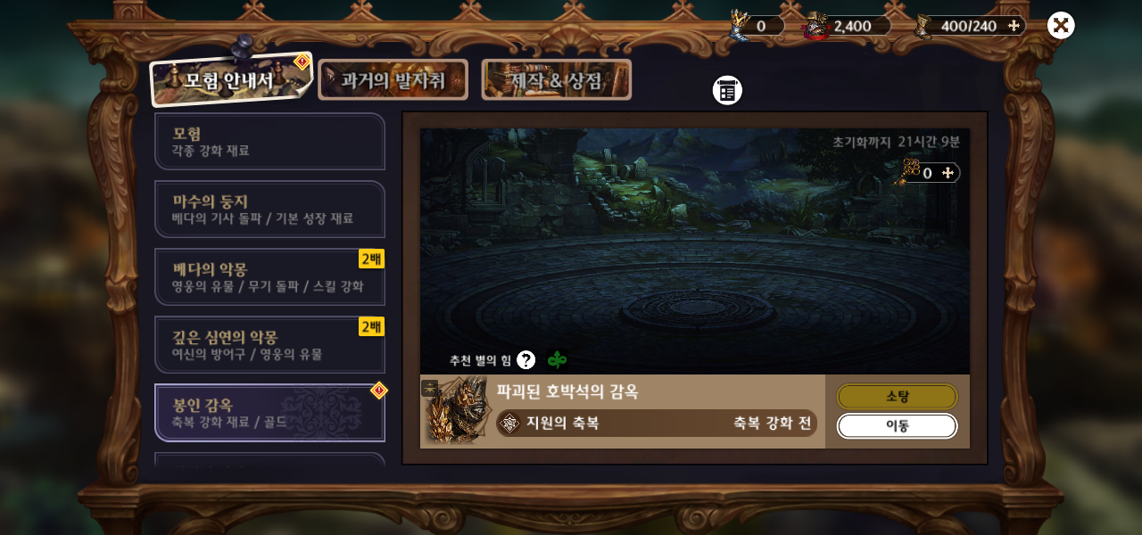 - 새로워진 봉인 감옥은 메인 메뉴의 [봉인 감옥] 버튼 혹은 [모험 안내서]를 통해 진입할 수 있습니다.