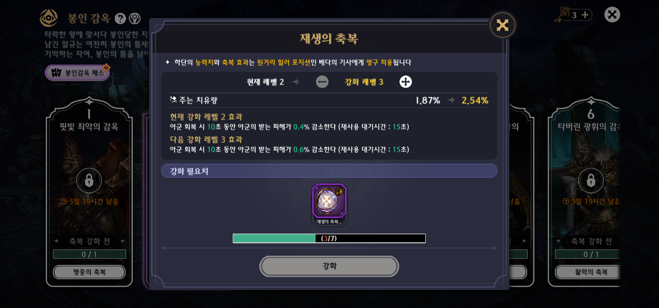 * [봉인 감옥] 에서 획득한 [여신의 축복 강화석]을 통해 [여신의 축복]을 강화할 수 있습니다.