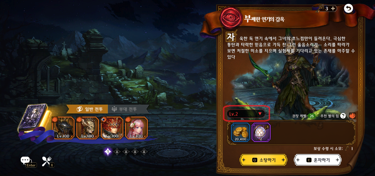 - [봉인 감옥] 별로 추천 속성이 존재하고, [일반 전투]와 [부대 전투]를 선택하여 전투를 진행하실 수 있습니다.