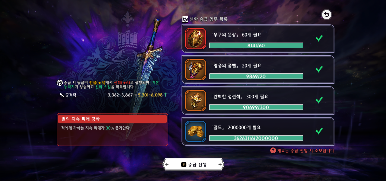 - 각 무기에 부여된 특정 미션을 수행하면 [신화 승급]을 진행하실 수 있습니다.