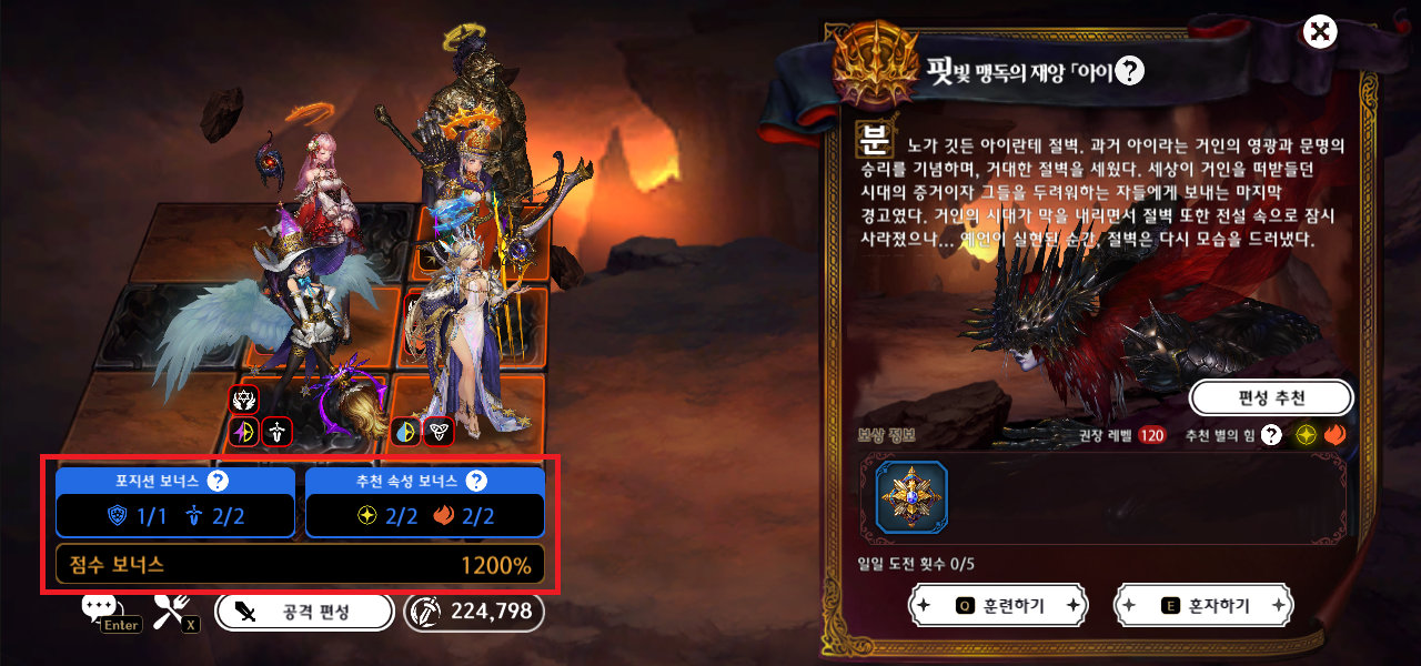 - 태고의 거인 보스 도전 시 정해진 포지션과 추천 속성을 만족할 경우 높은 점수 보너스를 획득할 수 있습니다.