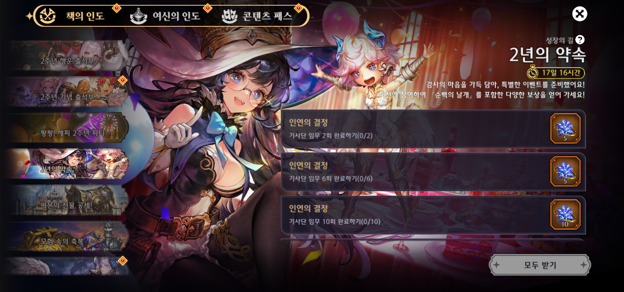 - [2주년 감사 패키지]는 픽업 베다의 기사 선택권, 픽업 기사 전용 무기 선택권 등