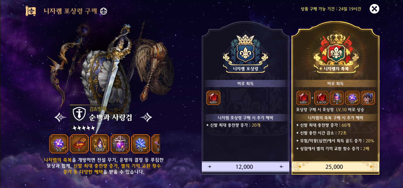 - 새로운 포상령에서 [니자렘의 축복] 구매 시 루비 2280개, 운명의 결정 30개,
