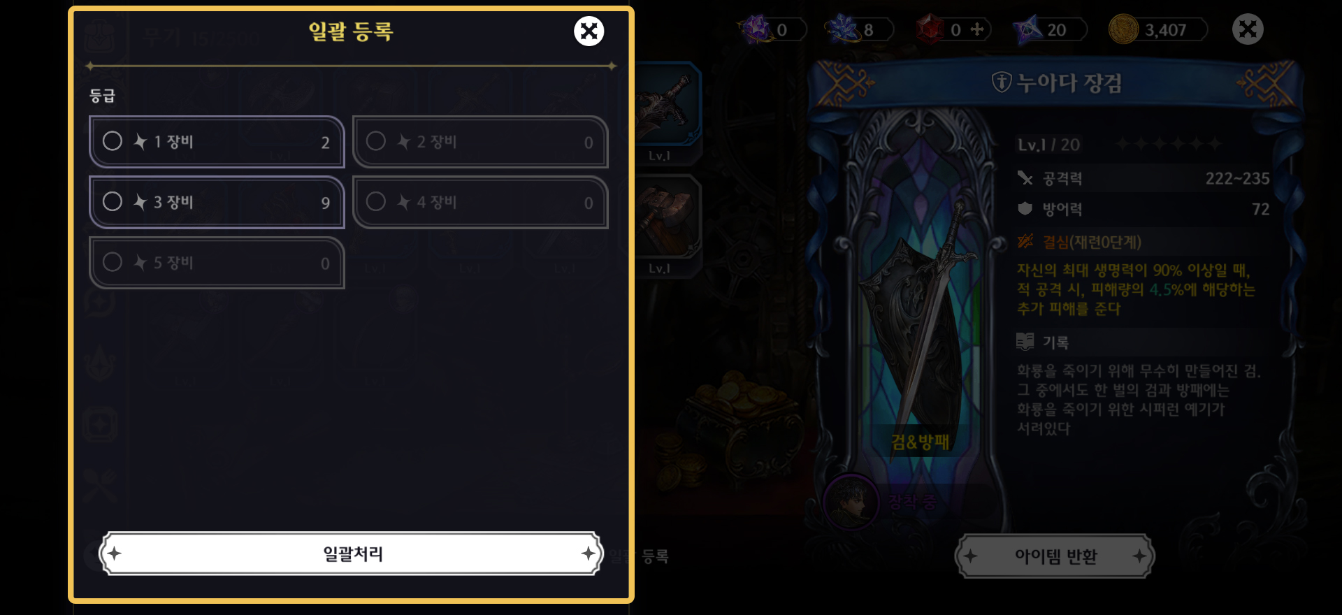 · '일괄 등록'을 통해 원하는 등급의 아이템들을 한번에 등록하여 반환할 수 있습니다.