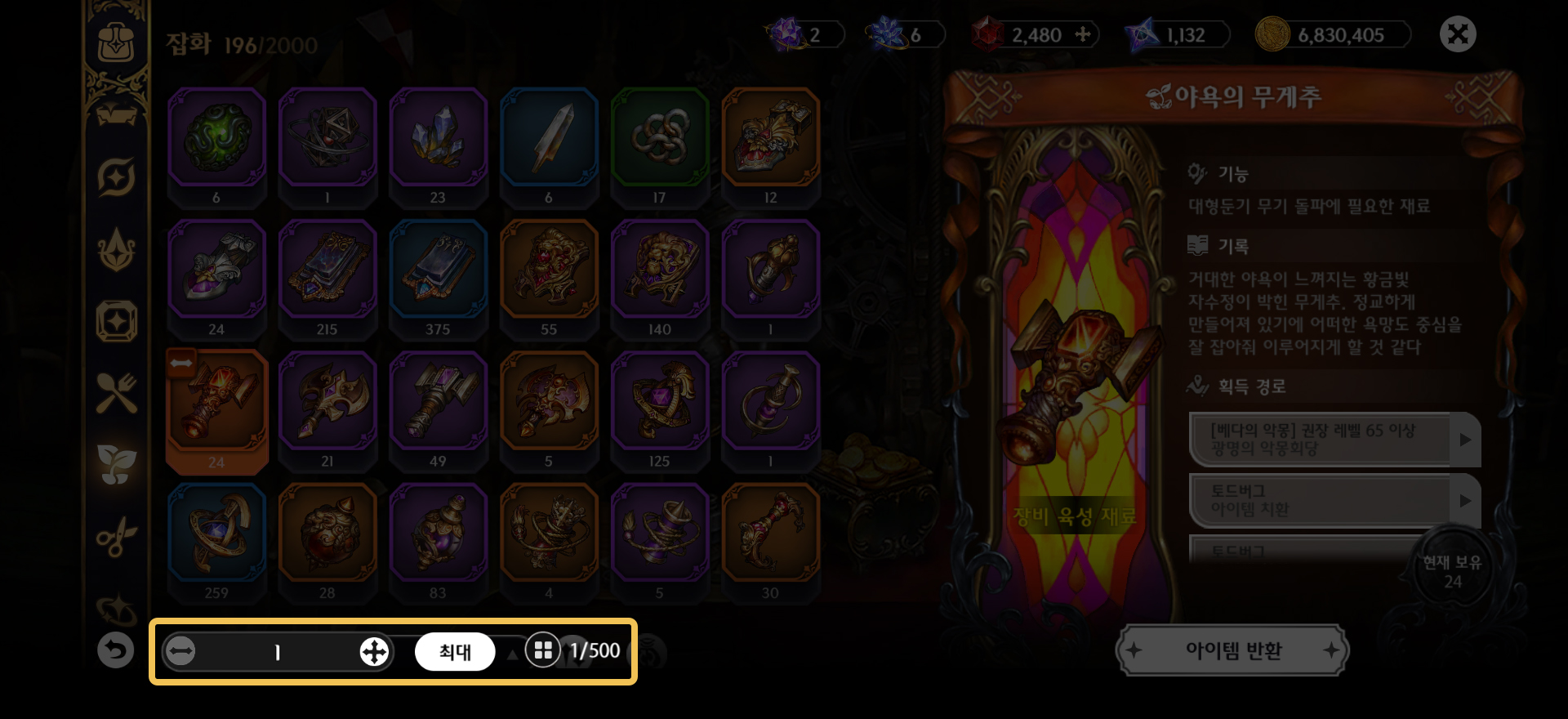 4. 가방 > 잡화 목록에 있는 아이템의 경우 화면 하단에 수량 창이 노출되어 반환 수량 설정이 가능합니다.