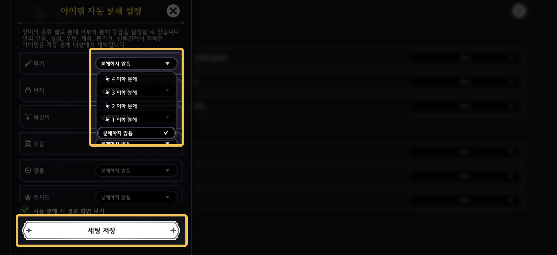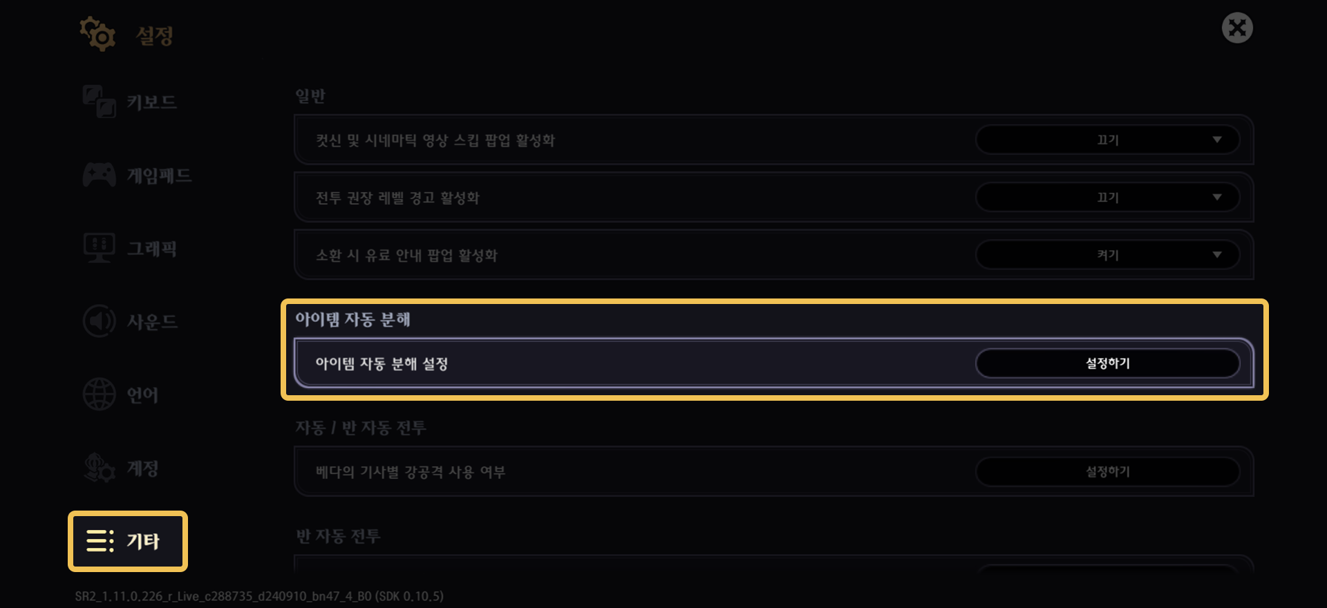 - ‘설정’ 기타 탭에서 아이템 자동 분해 설정을 확인할 수 있으며, 장비별 자동 분해를 진행할 등급을 선택할 수 있습니다.
