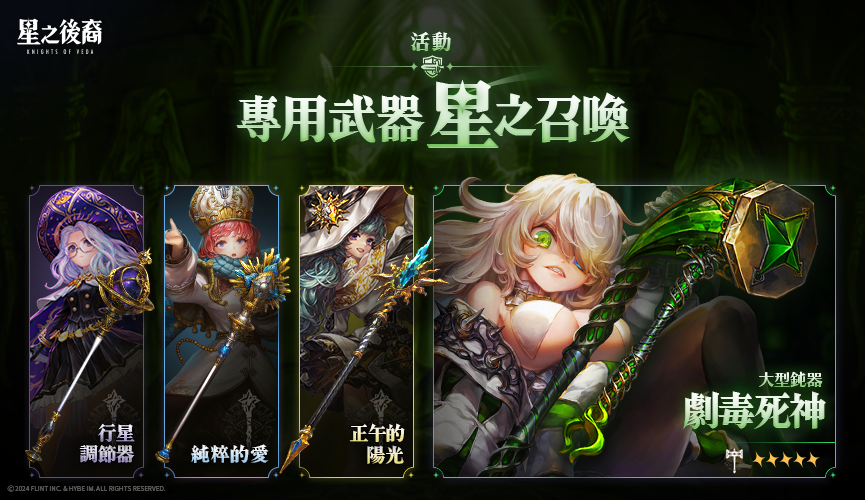 - 在活動期間進行「專用武器星之召喚: 性能驗證」, 5星武器「 劇毒死神 (大型鈍器 )」召喚出現機率提高。