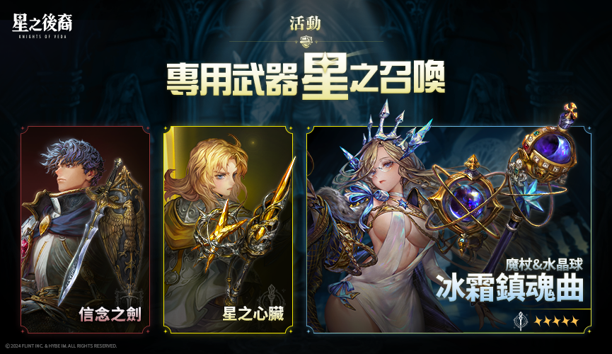 - 在活動期間進行「專用武器星之召喚 : 星海下甦醒的武具」,每進行300次召喚,即可獲得一次自選「第1季精選5星吠陀騎士專用武器」額外獎勵。