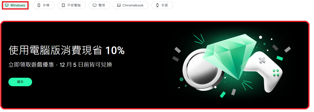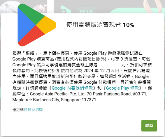 使用 Google Play 遊戲電腦測試版在 Google Play 購買商品 (應用程式內訂閱項目除外),可享 9 折優惠。每個 Google Play 帳戶存在可享優惠的購買金額上限。折扣可在結帳時套用。兌換後的折扣使用期限為 2024年12月5日。如發現詐欺活動,Google 有權隨時撤銷優惠。消費者必須使用 Google 付款帳戶,且符合年齡相關規定。詳情請參閱[Google內容促銷條款]及[Google服務條款]。