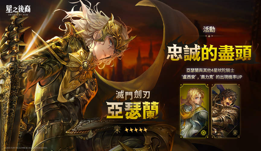 - 在活動期間進行 「精選英雄活動 : 滅門劍刃」時, 4星吠陀騎士「光之權能 盧西安」、「岩騎士 奧力克」的召喚出現機率提高。