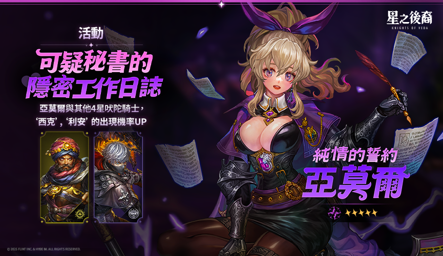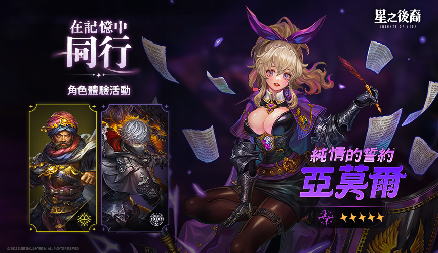 - 在活動期間進行「精選英雄活動 : 純情的誓約」,召喚出5星吠陀騎士時,將以100%機率出現「純情的誓約 亞莫爾」。