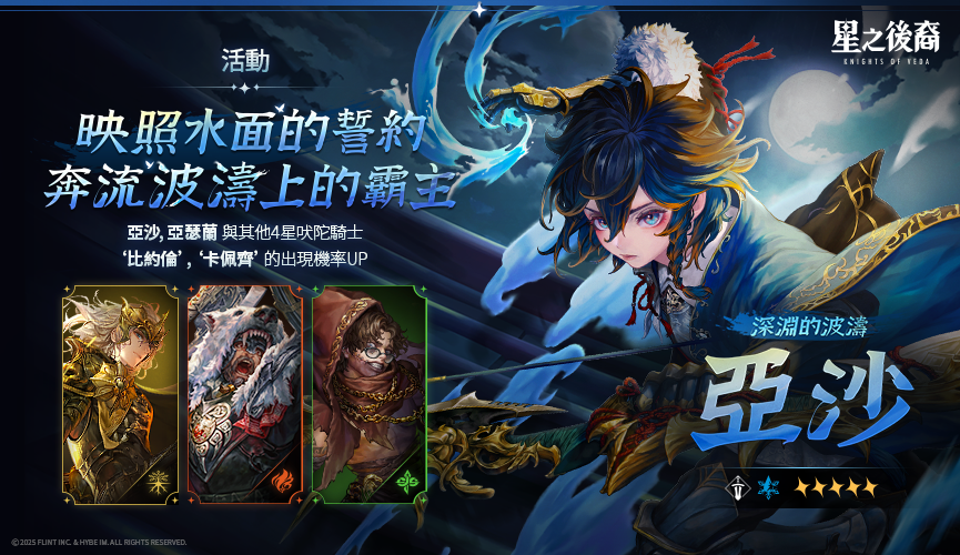 - 在活動期間進行「精選英雄活動 : 深淵的波濤 」, 召喚出5星吠陀騎士時,將以100%機率出現 「深淵的波濤 亞沙」。