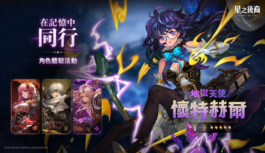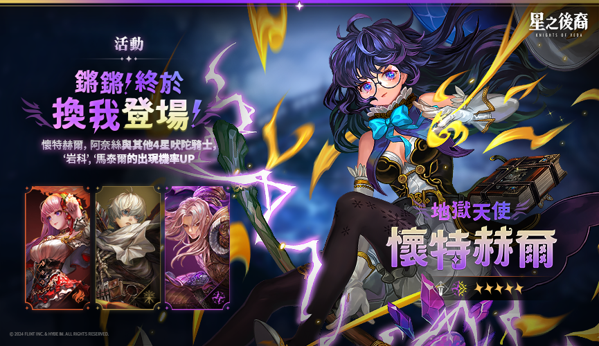 - 在活動期間進行「精選英雄活動 : 地獄天使」, 召喚出5星吠陀騎士時,將以100%機率出現 「地獄天使 懷特赫爾」。