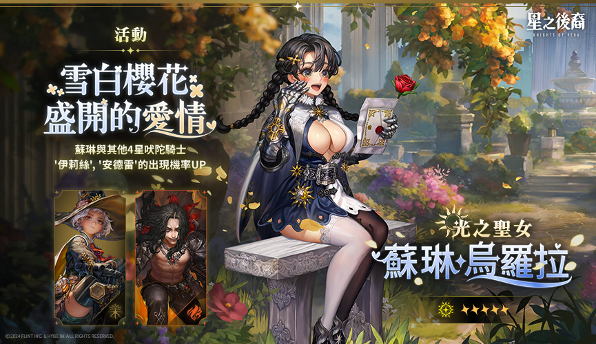 - 在活動期間進行「活動星之召喚 : 光之聖女 」, 5星吠陀騎士「光之聖女 蘇琳」召喚出現機率提高。