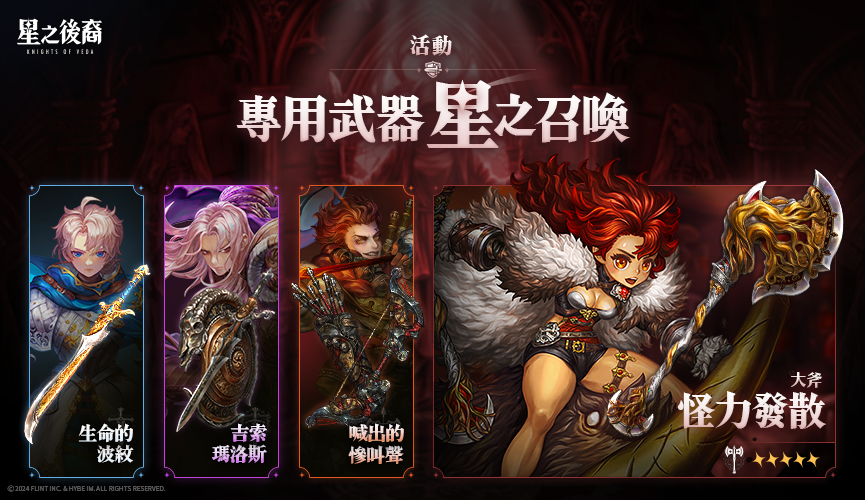 - 在活動期間進行「專用武器星之召喚: 超級超級非常非常強的斧頭」, 5星武器「怪力發散(大斧)」召喚出現機率提高。